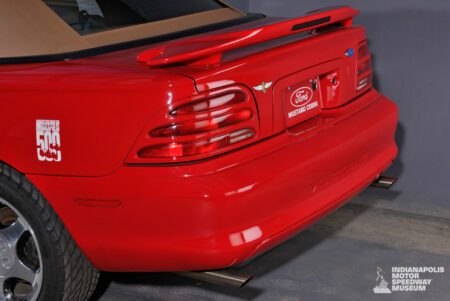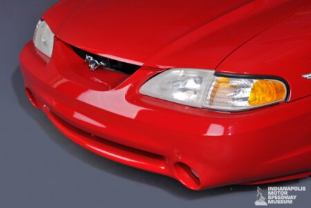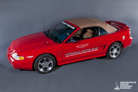 The 1994 Mustang Cobra, a major redesign to bring the Ford Mustang back to its iconic long nose/short deck proportions, was selected to pace the 78th running of the Indianapolis 500. Ford produced 1,000 SVT Cobra convertibles equipped with Ford’s 5.0-liter V8 engine mated with manual transmission producing 240 horsepower. All replicas were painted Rio Red with unique Indianapolis 500 graphics and Saddle Tan interiors.